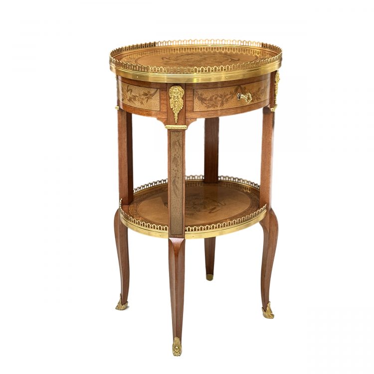 A late 19th century, French, Transitional tulipwood side table of the finest quality, after a model by Topino. Of oval form, the marquetry inlaid top with pierced gilt metal gallery, above a single oak lined drawer, each frieze inlaid with garlands. The four elongated cabriole legs, headed by finely chased and gilded bearded satyrs, above a narrow leafy inlaid panel and ending in gilt sabots. The lower tier and top inlaid with scrolling carnation flowers. The mask mounts with incised ‘ZJ’ from the master moulds.